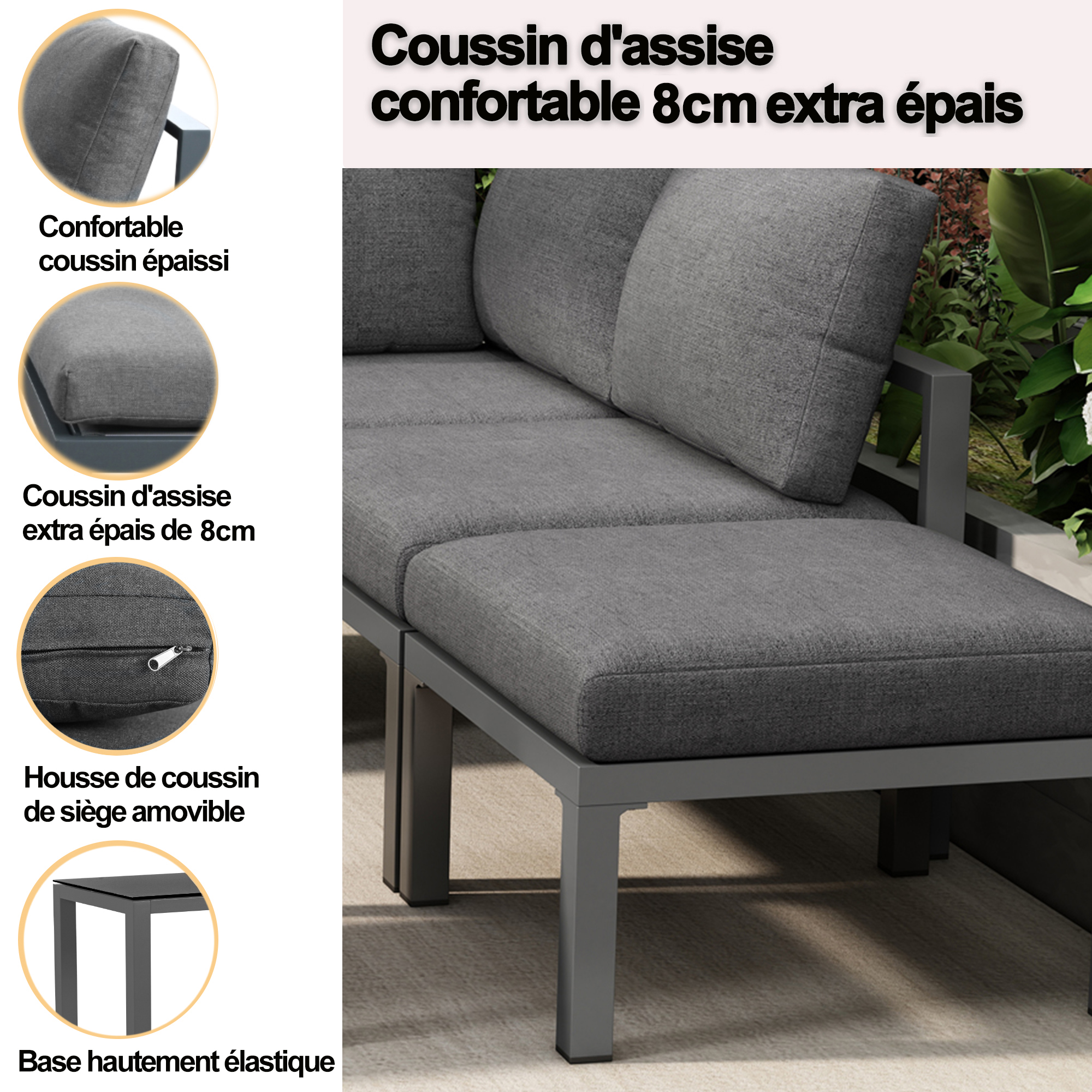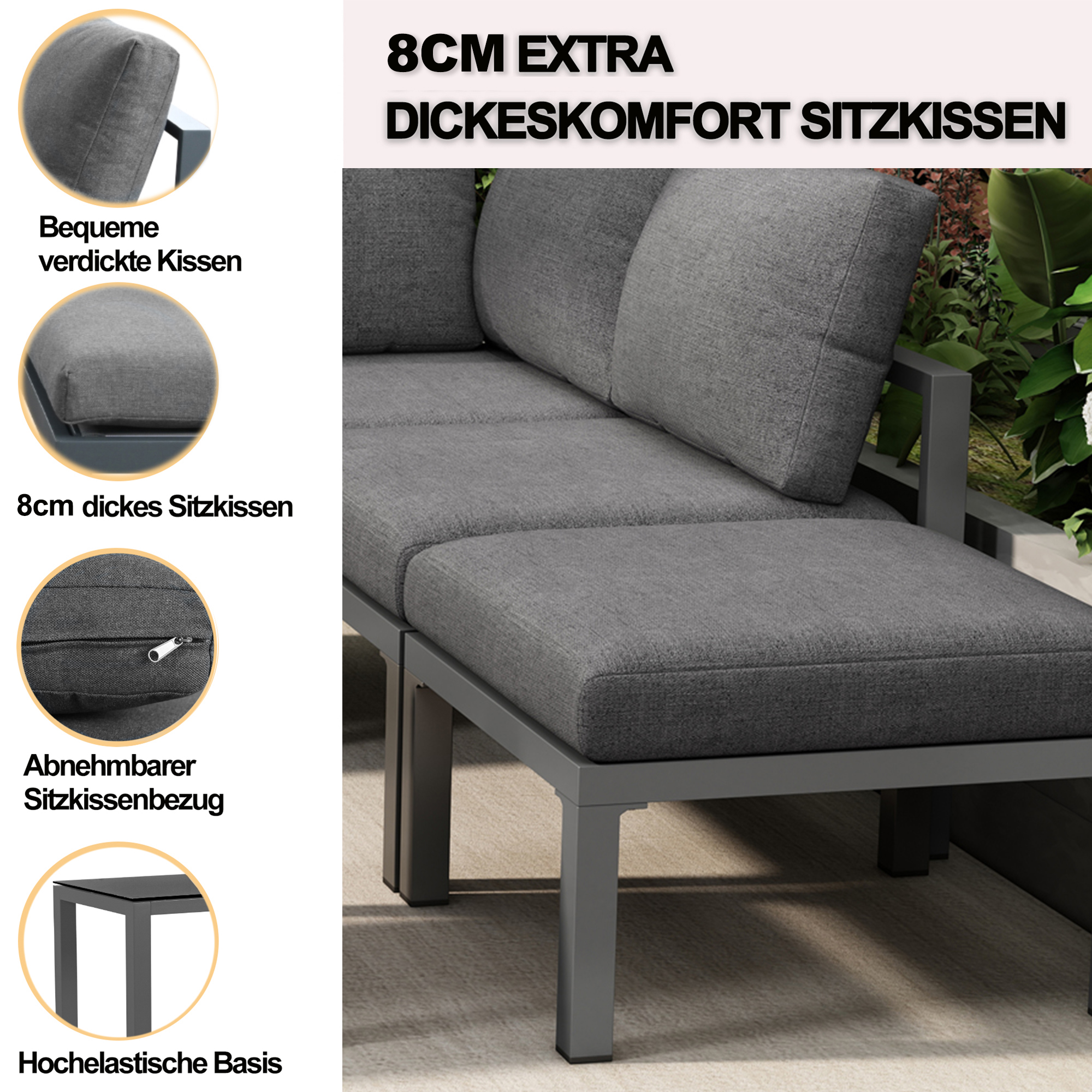 This high-quality garden furniture set combines comfort and functionality and is perfect for your garden, balcony or patio. The seat cushions are 8 cm thick, soft and thick, providing you with the ultimate in comfort, as if you were sitting on a cloud.